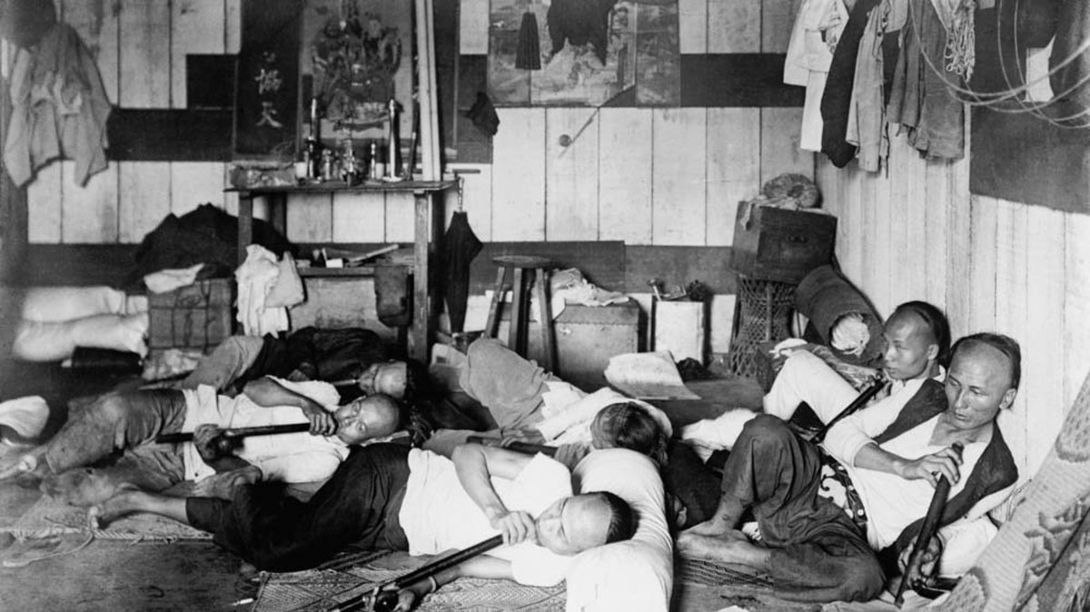 In San Francisco, smoking opium in the city limits is banned and is confined to neighboring Chinatowns and their opium dens.