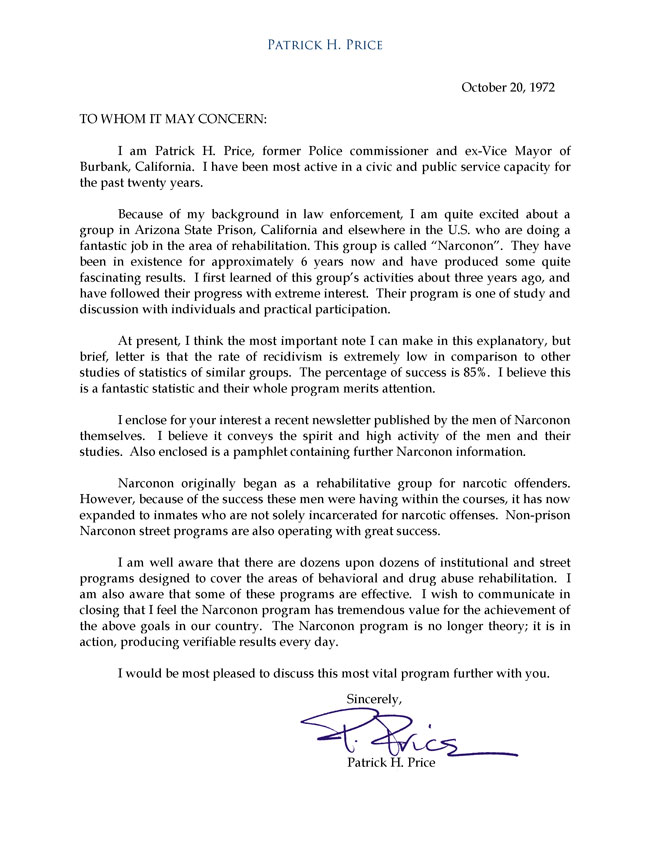 I am well aware that there are dozens upon dozens of institutional and street programs designed to cover the areas of behavioral and drug abuse rehabilitation. I am also aware that some of these programs are effective. I wish to communicate in closing that I feel the Narconon program has tremendous value for the achievement of the above goals in our country. The Narconon program is no longer theory; it is in action, producing verifiable results every day.