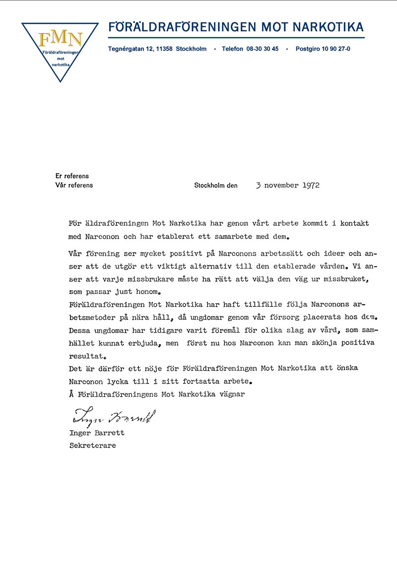 F?r?ldraf?reningen Mot Narkotika har haft tillf?lle f?lja Narconons arbetsmetoder p? n?ra h?ll, d? ungdomar genom v?r f?rsorg placerats hos dem. Dessa ungdomar har tidigare varit f?rem?l f?r olika slag av v?rd, som samh?llet kunnat erbjuda, men f?rst nu hos Narconon kan man sk?nja positiva resultat.