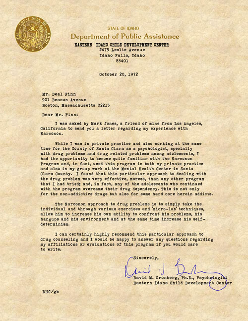 While I was in private practice and also working at the same time for the County of Santa Clara as a psychologist, specially with drug problems and drug related problems among adolescents, I had the opportunity to become quite familiar with the Narconon Program and, in fact, used this program in both my private practice and also in my group work at the Mental Health Center in Santa Clara County. I found that this particular approach to dealing with the drug problem was very effective, moreso, than any other program that I had tried; and, in fact, any of the adolescents who continued with the program overcame their drug dependency. This is not only for the non-addictive drugs but also for some hard core heroin addicts.