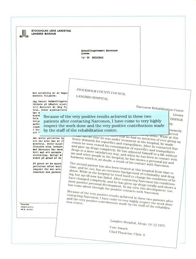 I know of Narconon Rehabilitation Centre through two patients formerly treated at Langbro Hospital. One of the patients, before he was transferred to Narconon, has an extensive background of drug abuse. While at this hospital he told us many times that he had no intention of ever giving up drugs. All the time he was under treatment in the hospital, he made heavy demands for soporifics and tranquilizers. After he contacted Narconon he soon ceased his consumption of soporifics and tranquilizers and gave up drugs completely. He has adjusted himself to a life without drugs in a most satisfactory way, and when he has been in contact with me and other people in the hospital, he has shown a personal joy and harmony which is, no doubt, a result of his contact with Narconon.
