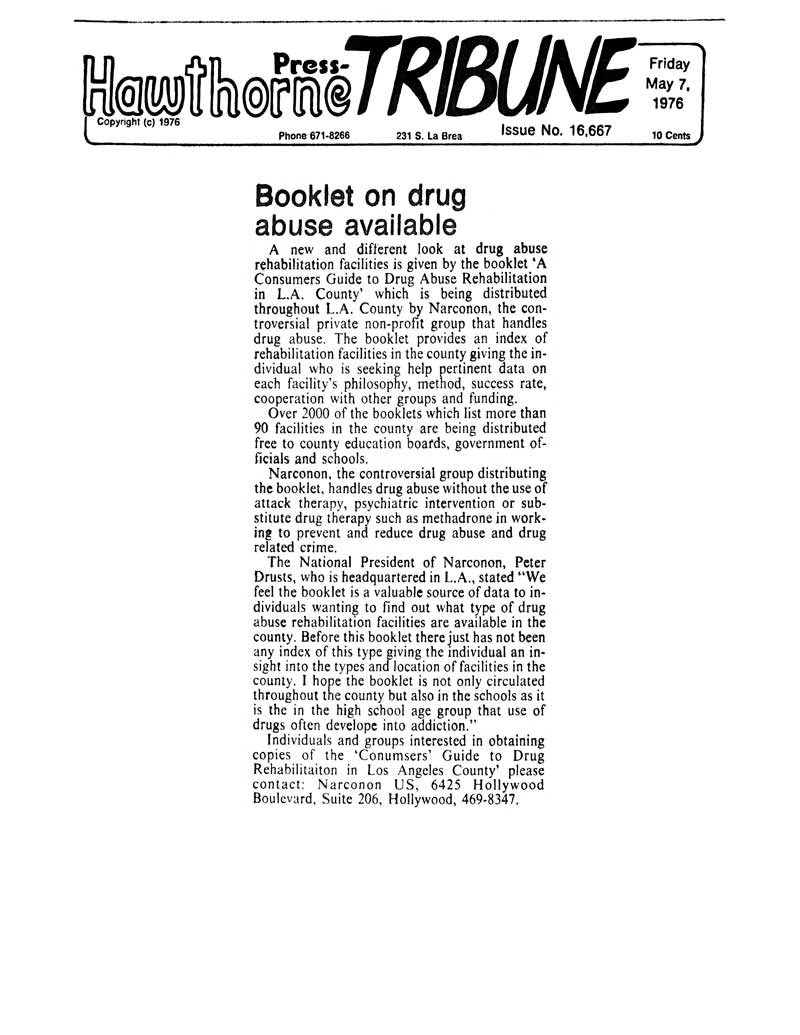 The National President of Narconon, headquartered in L. A., stated “We feel the booklet is a valuable source of data to individuals wanting to find out what type of drug abuse rehabilitation facilities are available in the county. Before this booklet there just has not been any index of this type giving the individual an insight into the types and location of facilities in the county. I hope the booklet is not only circulated throughout the county but also in the schools as it is in the high school age groups that use of drugs often develops into addiction.”