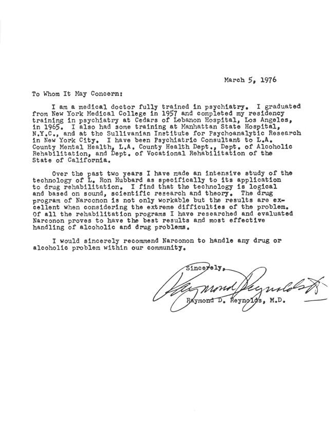 Over the past two years I have made an intensive study of the technology of L. Ron Hubbard as specifically to its application to drug rehabilitation. I find that the technology is logical and based on sound, scientific research and theory. The drug program of Narconon is not only workable but the results are excellent when considering the extreme difficulties of the problem. Of all the rehabilitation programs I have researched and evaluated Narconon proves to have the best results and most effective handling of alcoholic and drug problems.