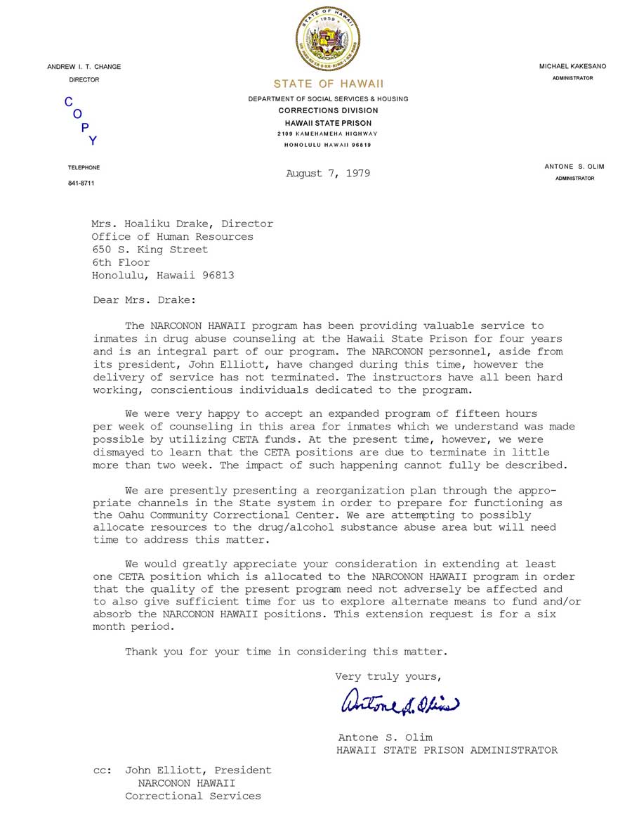 We would greatly appreciate your consideration in extending at least one CETA position which is allocated to the NARCONON HAWAII program in order that the quality of the present program need not adversely be affected and to also give sufficient time for us to explore alternate means to fund and/or absorb the NARCONON HAWAII positions. This extension request is for a six month period.
