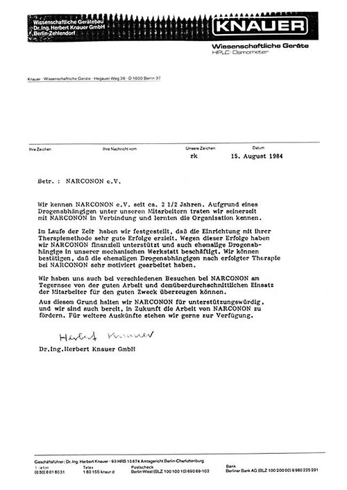 We are familiar with Narconon e.V. for about the past 2 1⁄2 years. As a result of drug addicts among our employees, we were at that time in connection with Narconon and got to know the organization.