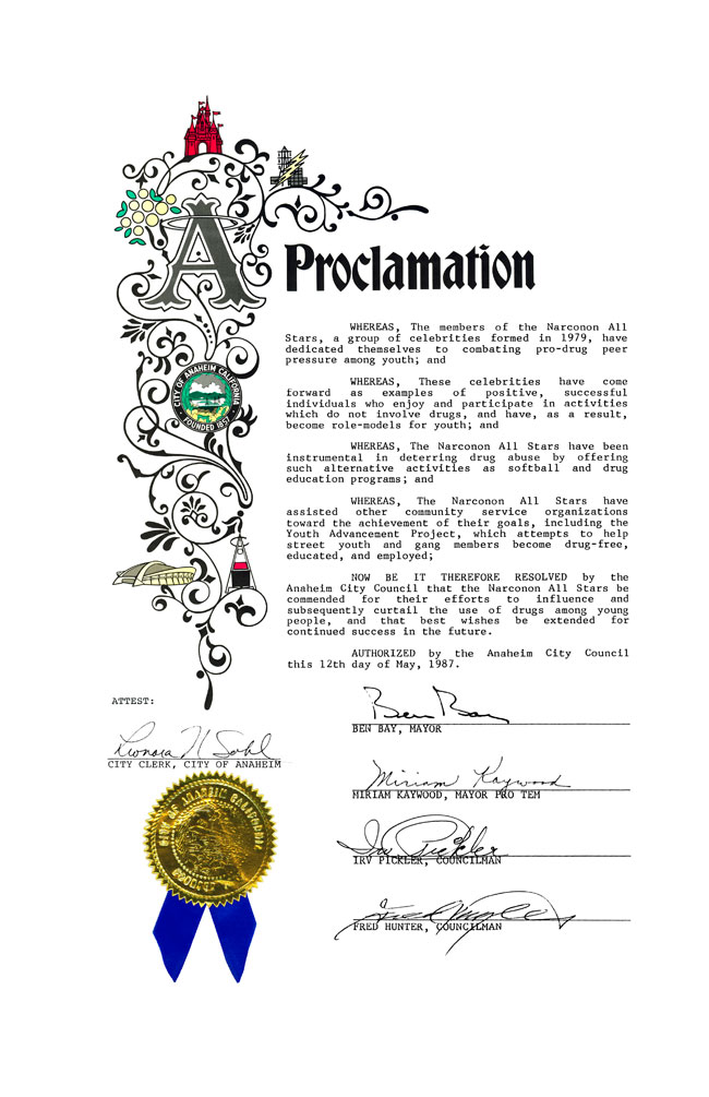NOW BE IT THEREFORE RESOLVED by the Anaheim City Council that the Narconon All Stars be commended for their efforts to influence and subsequently curtail the use of drugs among young people, and that best wishes be extended for continued success in the future.