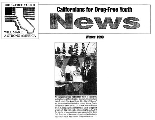 All Stars celebrated Red Ribbon Week at a celebrity softball game at Tom Bradley Stadium, Birmingham High School in Van Nuys. Kirstie Alley, Star of “Cheers” led a team of celebrities in Narconon’s Annual Celebrity Softball Game on Oct. 24 to kick off Red Ribbon Week. 1,000 people watched the All Stars go against a team of DJs from radio station KNAC. A CADFY Certificate of Appreciation was presented to John Duff, President of Narconon International and to Kirstie by Sharon Rose, Red Ribbon Program Director.