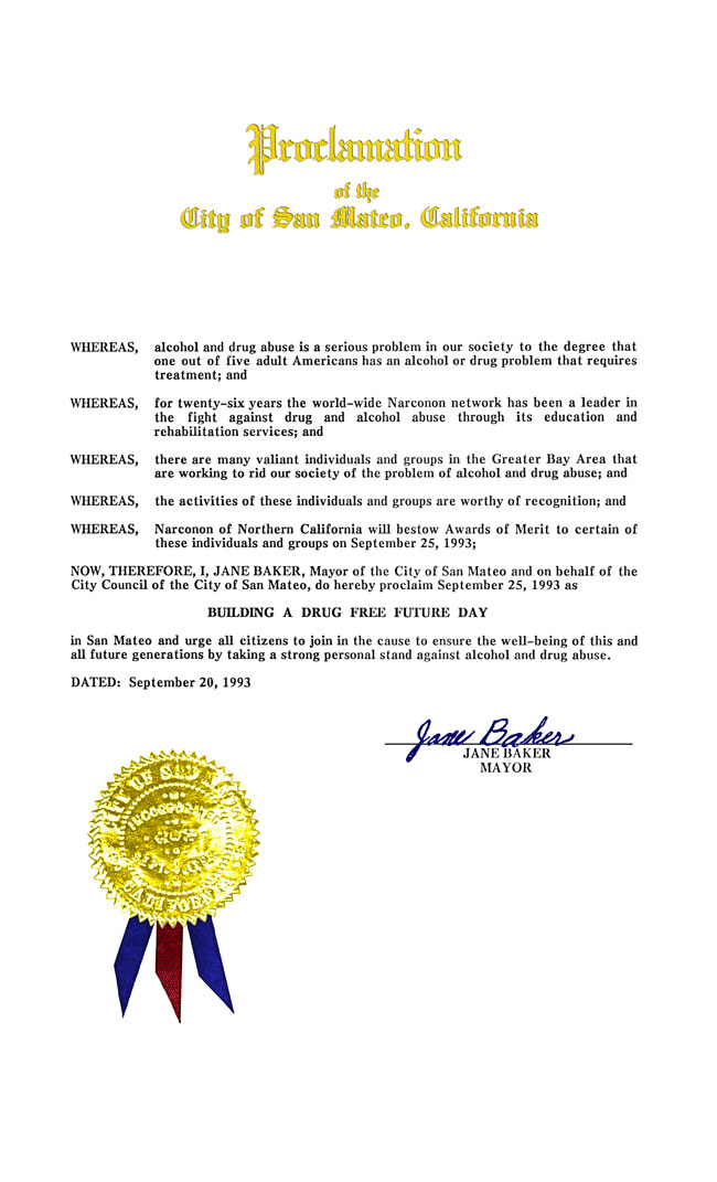 in San Mateo and urge all citizens to join in the cause to ensure the well-being of this and all future generations by taking a stand against drug and alcohol abuse.