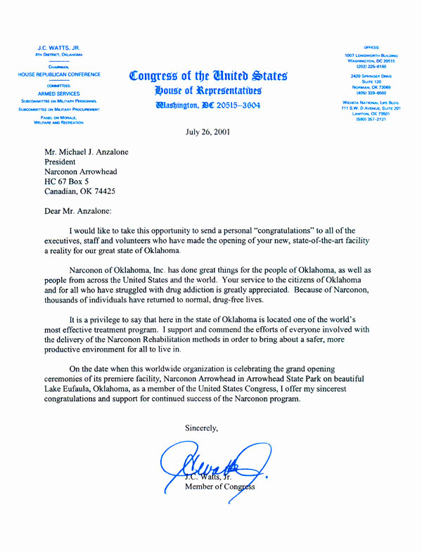 On the date when this worldwide organization is celebrating the grand opening ceremonies of its premiere facility, Narconon Arrowhead in Arrowhead State Park on beautiful Lake Eufaula, Oklahoma, as a member of the United States Congress, I offer my sincerest congratulations and support for continued success of the Narconon program.