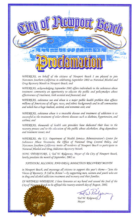 Whereas, on behalf of the citizens of Newport Beach I am pleased to join Narconon Southern California in celebrating September 2002 as National Alcohol and Drug Recovery Month in Newport Beach; and